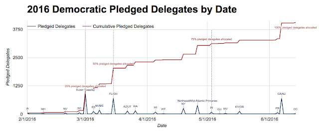 Note also that there are two figures for the Democrats. The first accounts for the cumulative allocation of all of the Democratic delegates. However, that includes superdelegates that will not be pledged to candidates based on the results of primaries and caucuses. When the 712 superdelegates are backed out -- see the final figure -- the picture looks largely the same among the 4051 pledged delegates. The pattern is virtually the same.